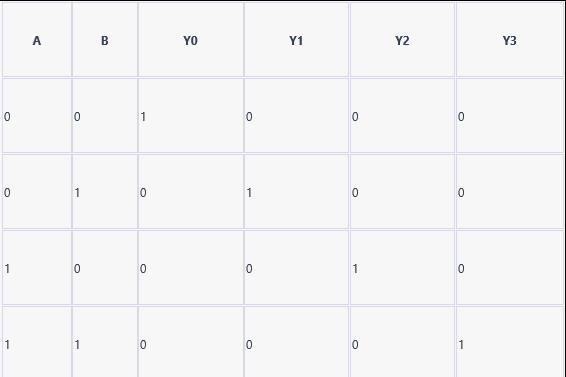3-Create a table with columns for inputs (A and B) and outputs (Y0, Y1, Y2, Y3):