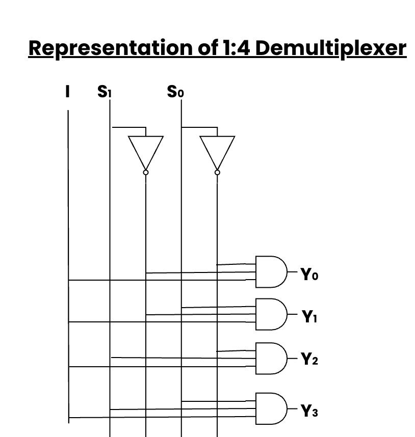 - A basic demultiplexer, often denoted as a 1:2 DEMUX, has one input (X), two outputs (Y0 and Y1), and one control input (S).